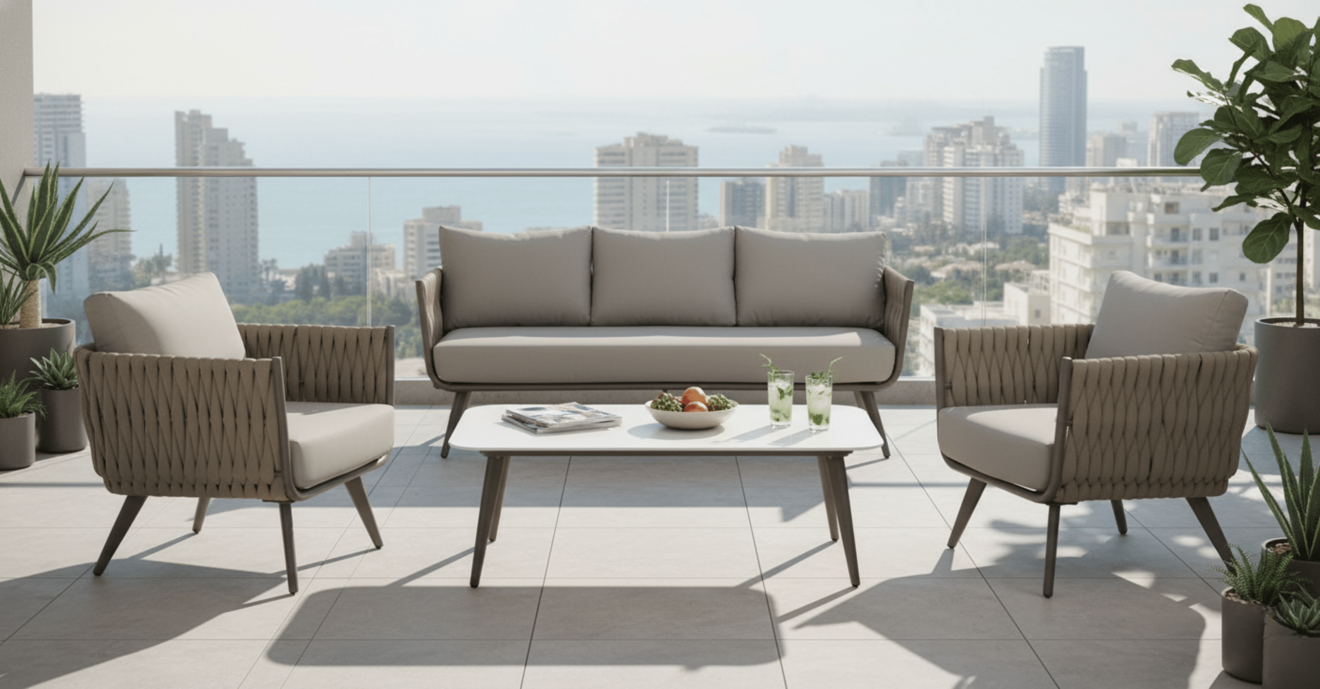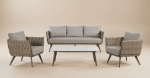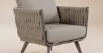 פינת ישיבה מיוחדת מאוד העשויה מבסיס אלומיניום בשילוב חבלים עבים ואיכותיים. מעניקה מראה מרשים במיוחד למרפסת או לחצר.