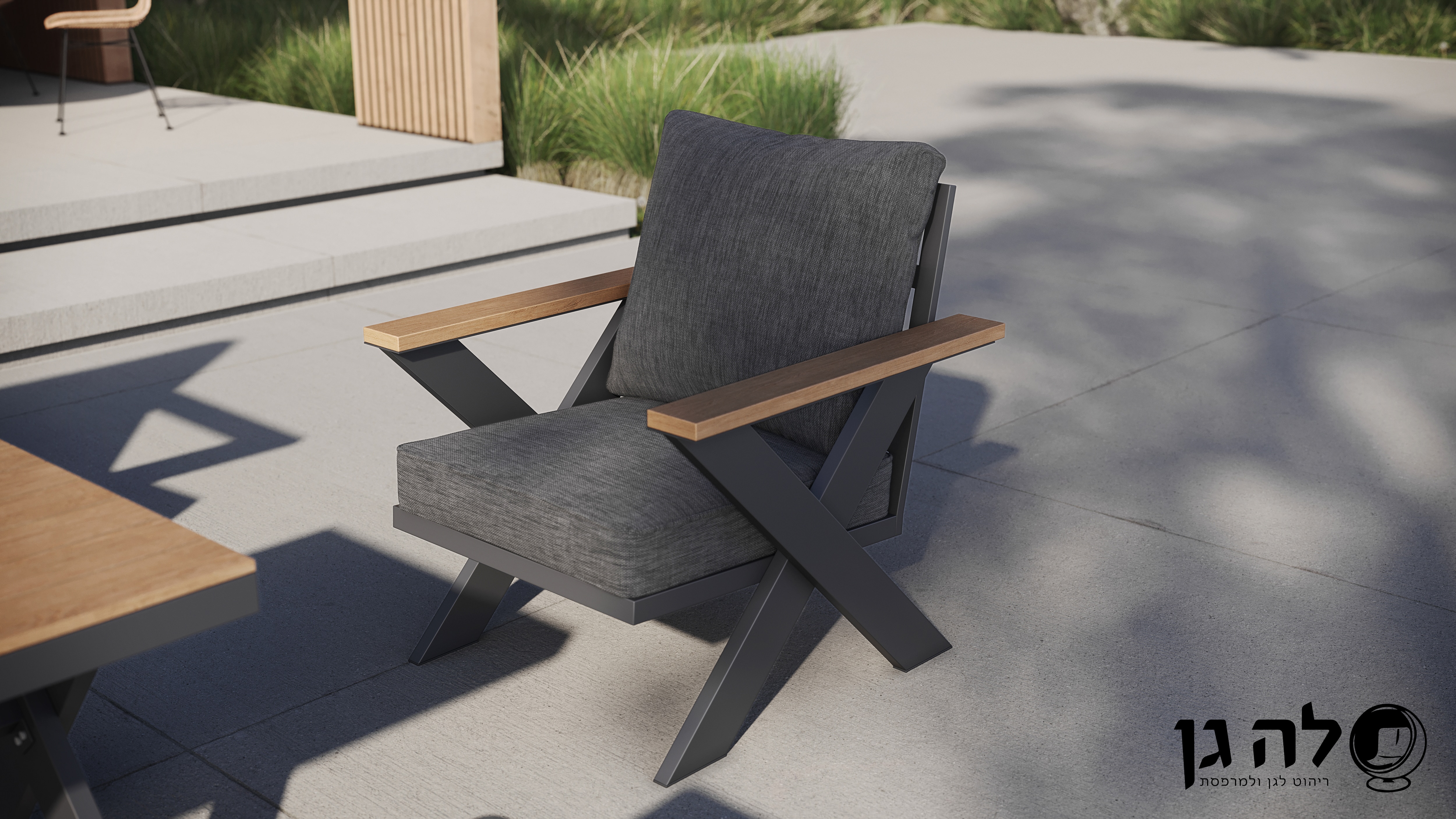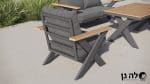 הידיות ופלטת השולחן מעוצבות מחומר דמוי עץ, המעניקות לפינה מראה טבעי וחם המשתלב בכל חלל חוץ.