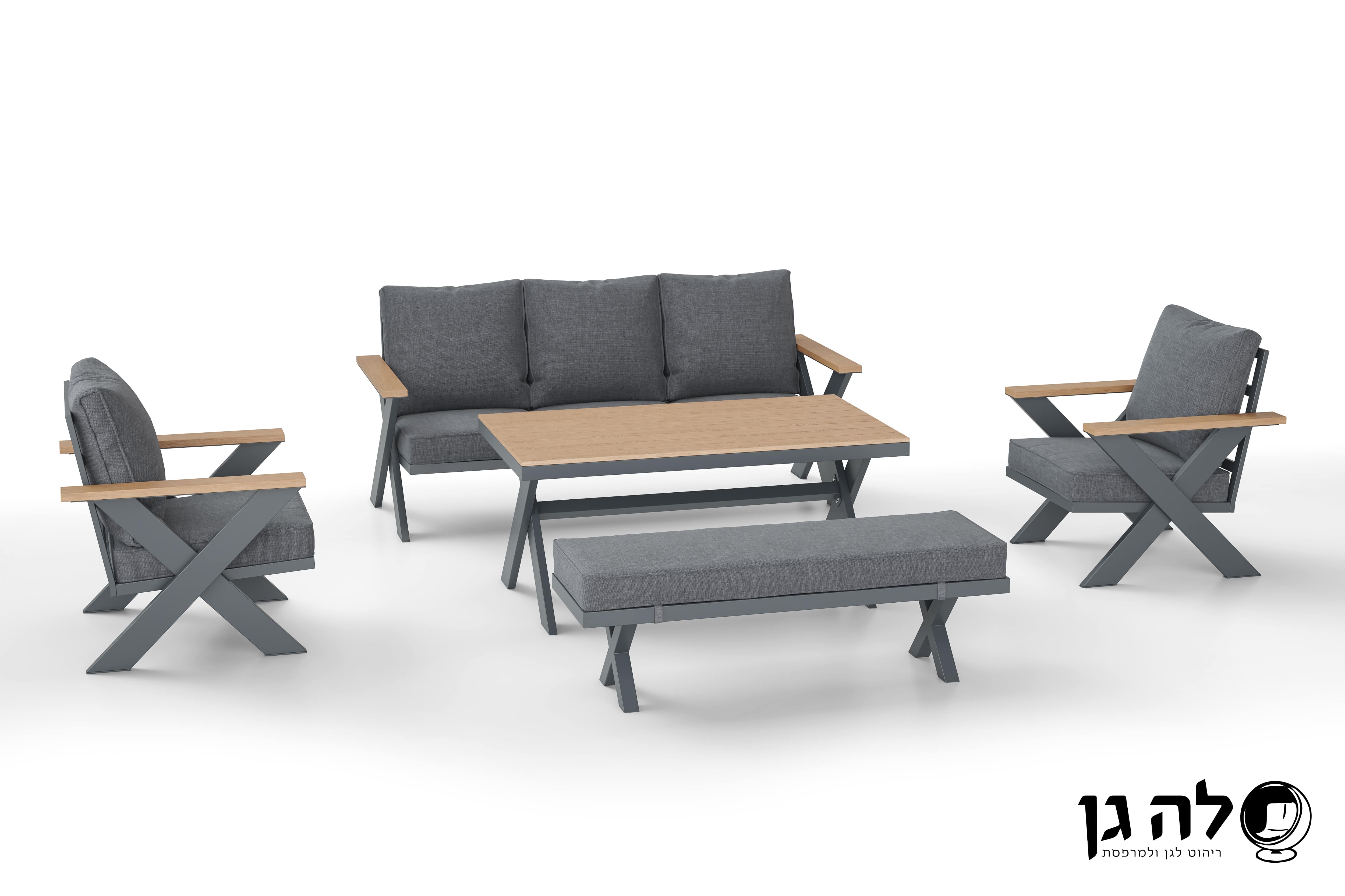 הפינה כוללת ארבעה מושבים נוחים: ספה תלת מושבית רחבה, שתי כורסאות יחיד, ספסל ושולחן גבוה בעיצוב תואם.