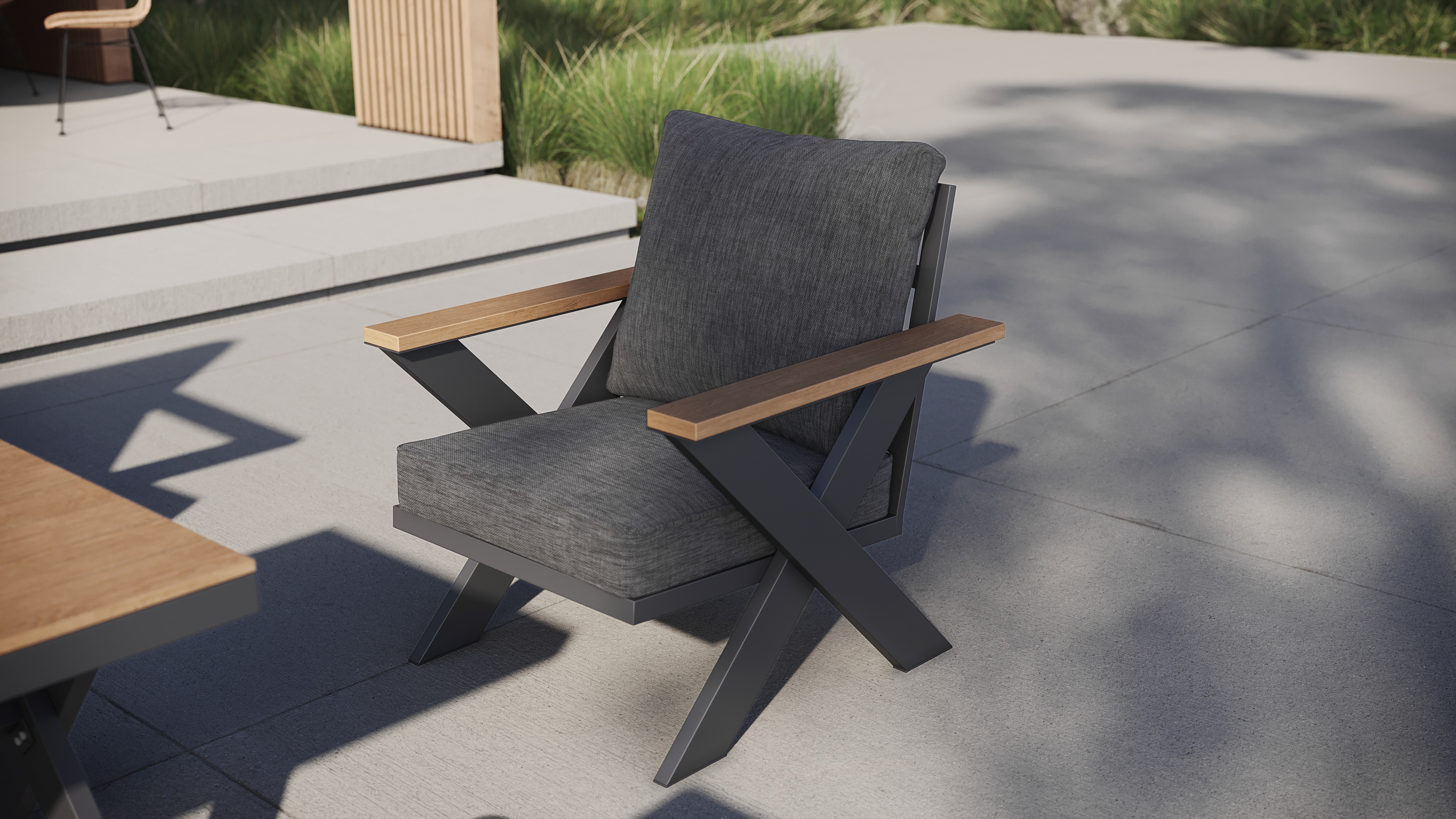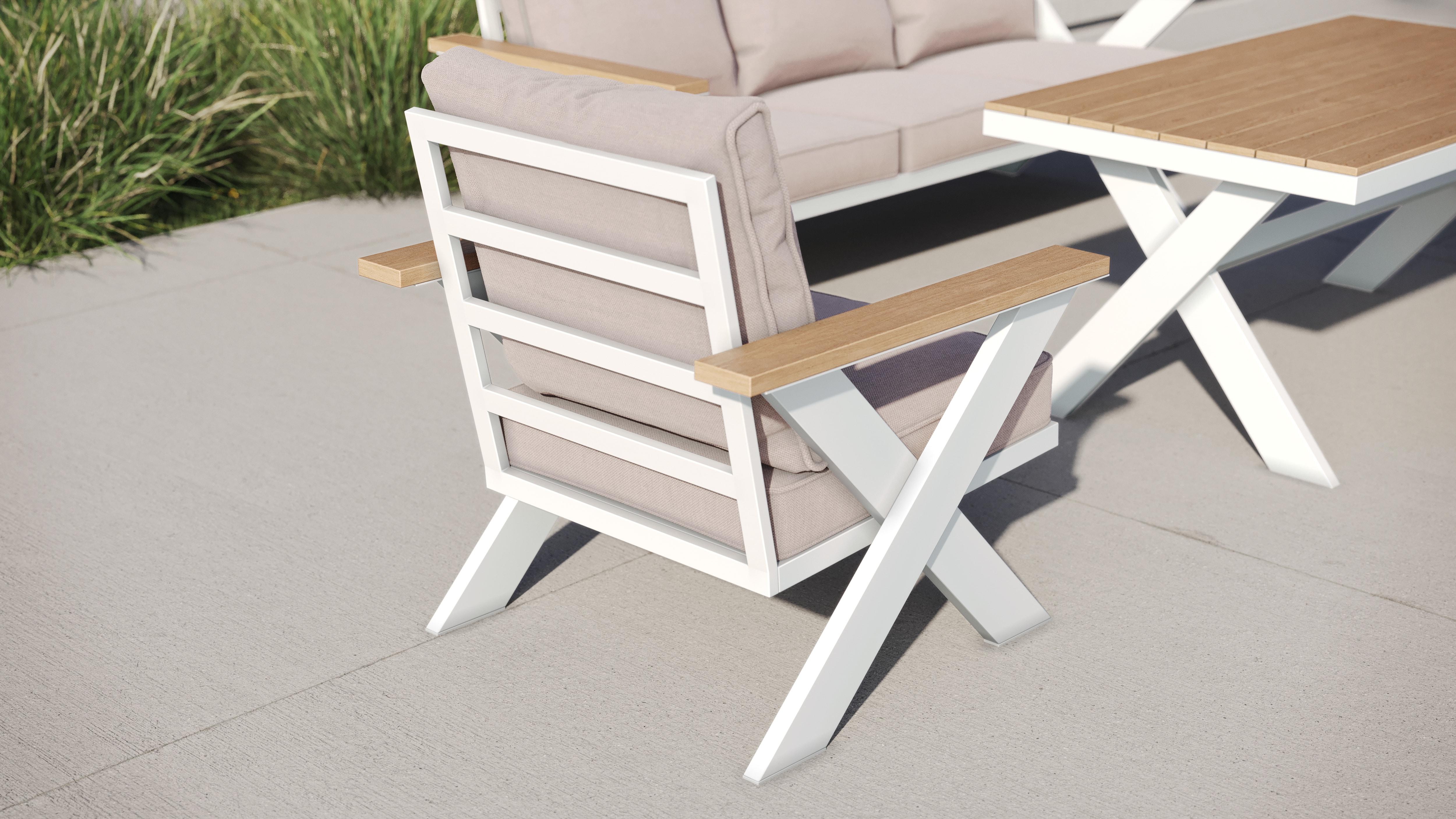 הידיות ופלטת השולחן מעוצבות מחומר דמוי עץ, המעניקות לפינה מראה טבעי וחם המשתלב בכל חלל חוץ.