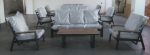 הפינה כוללת חמישה מושבים נוחים: ספה תלת-מושבית רחבה, שתי כורסאות מתכווננות בעיצוב תואם, ושולחן קפה מעוצב.