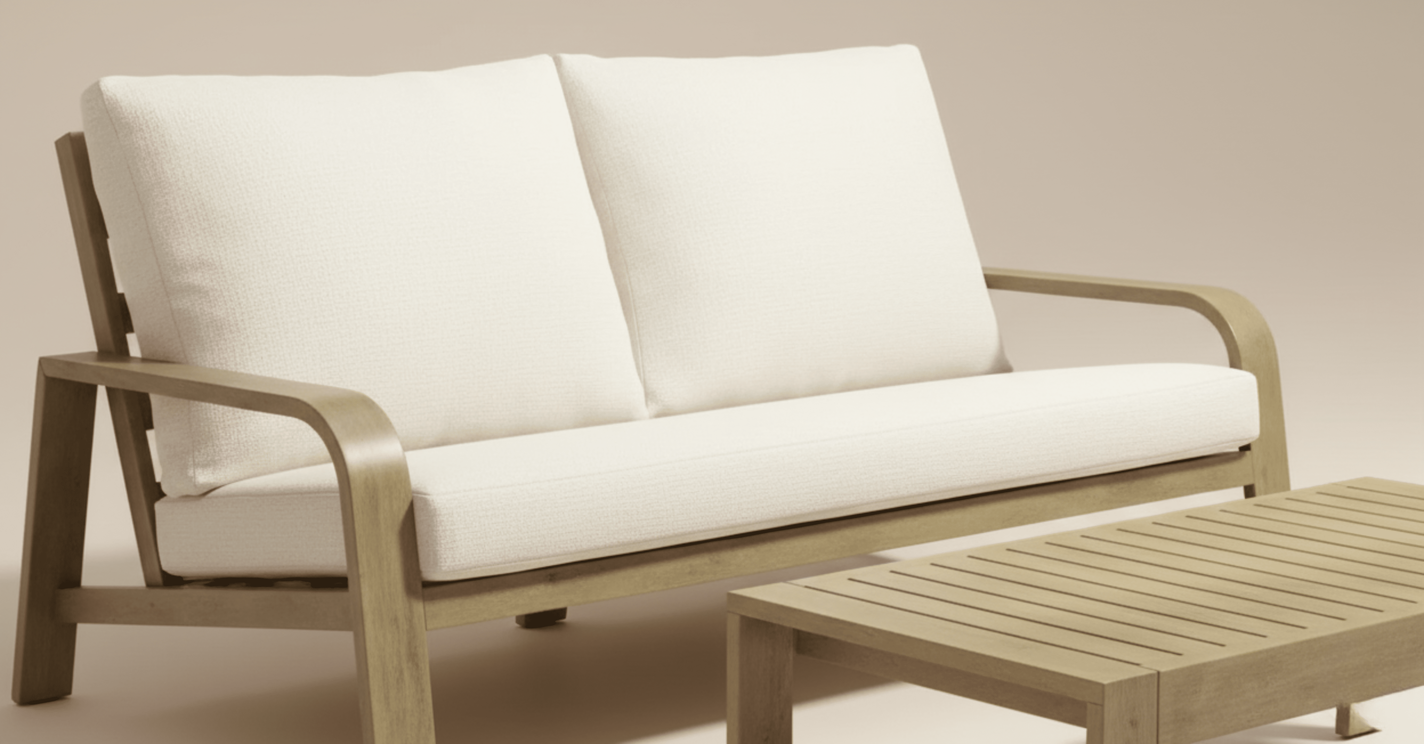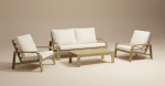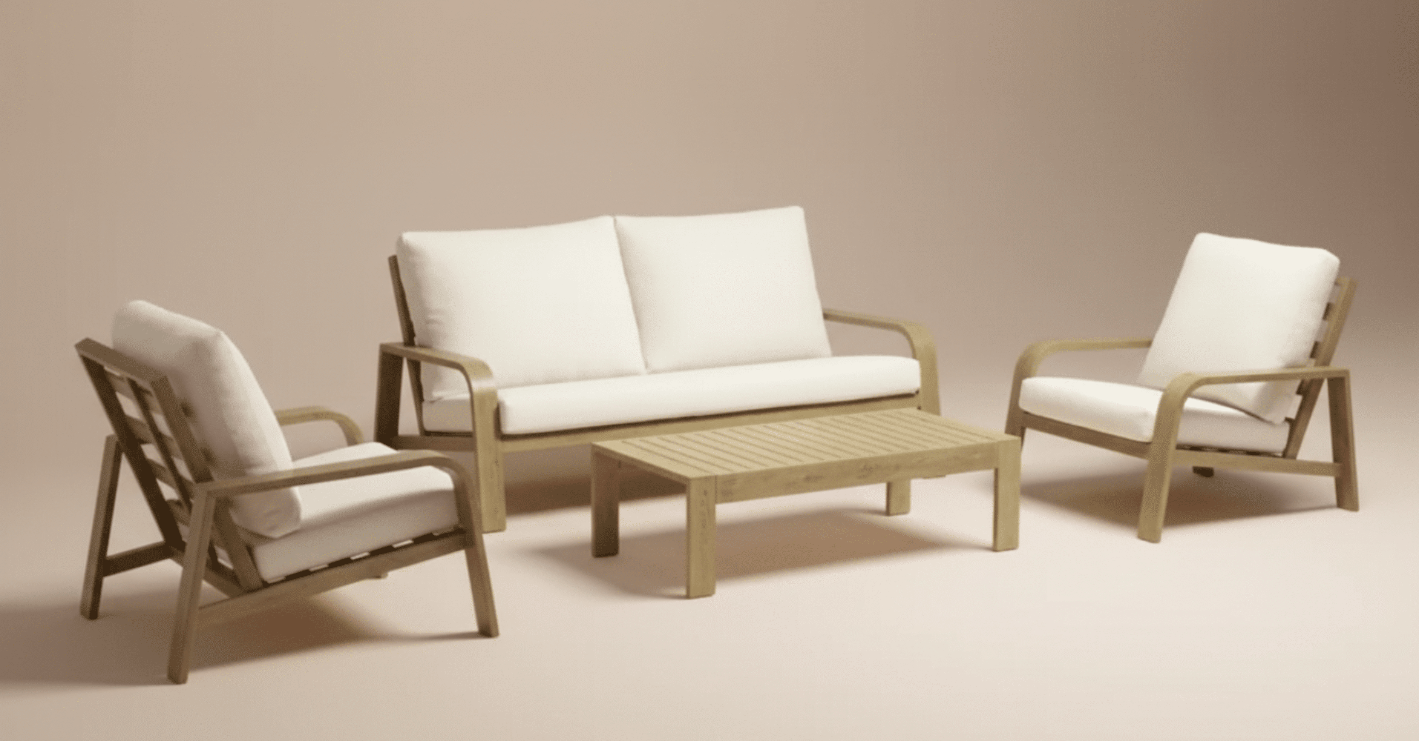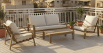 מערכת ישיבה מאלומיניום ודמוי עץ בעיצוב מודרני, בעלת חמישה מושבים ושולחן קפה