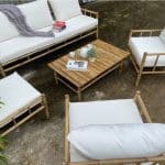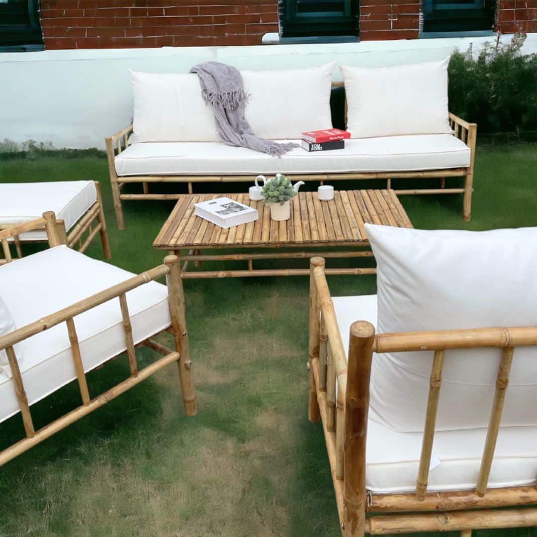 סט ישיבה מבמבוק הכולל ספה תלת-מושבית, כורסאות, הדום ושולחן, בעיצוב טבעי.