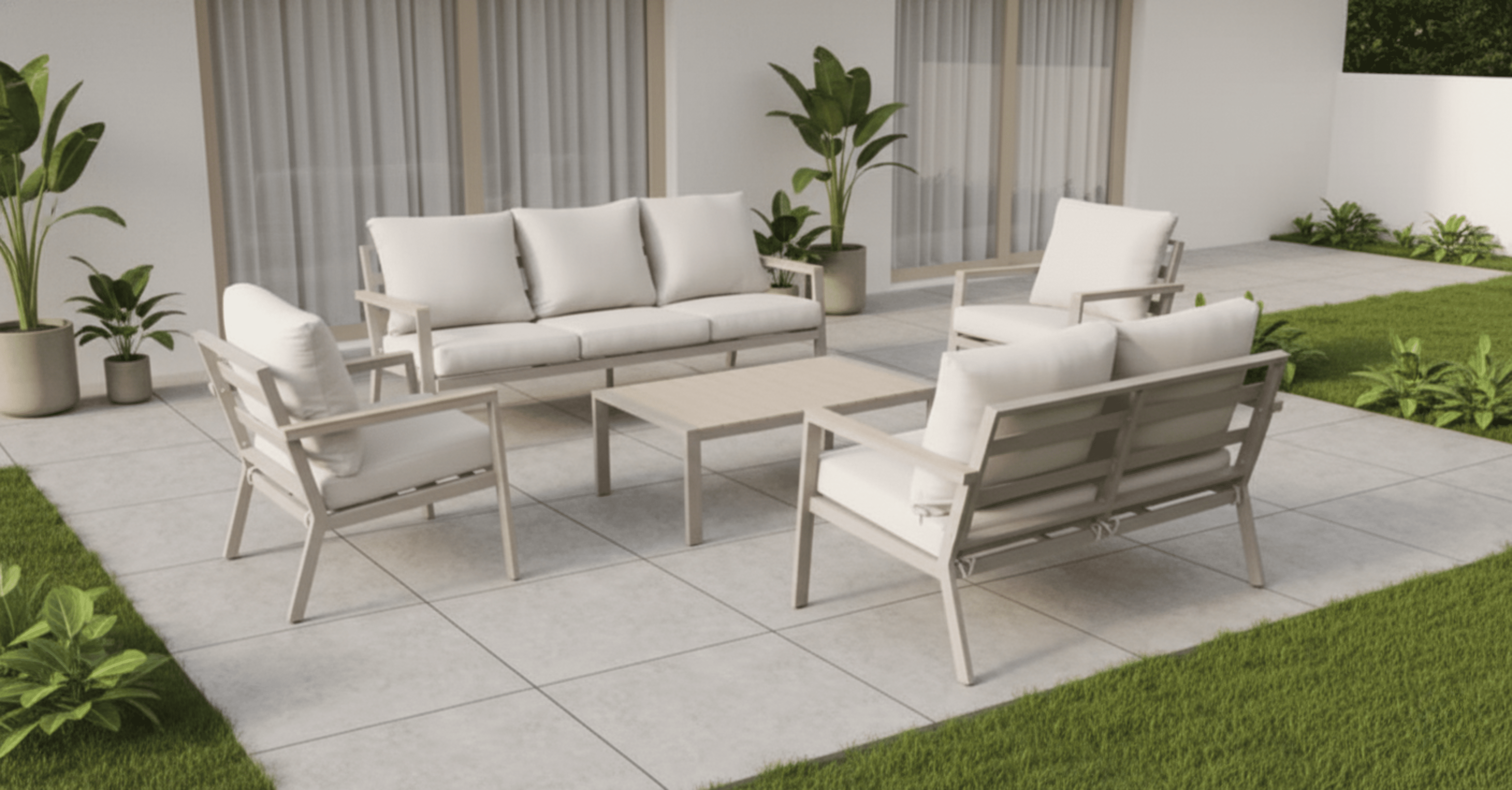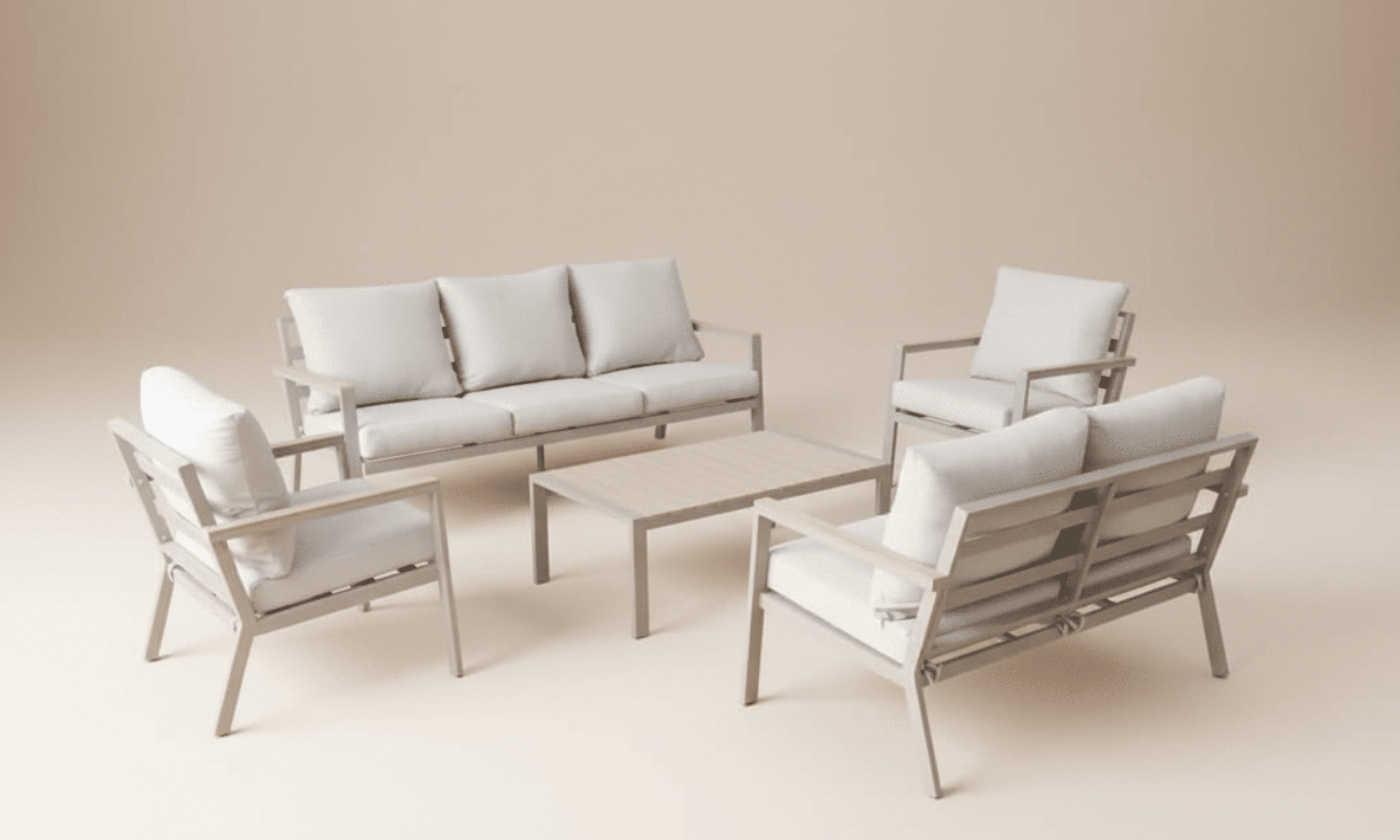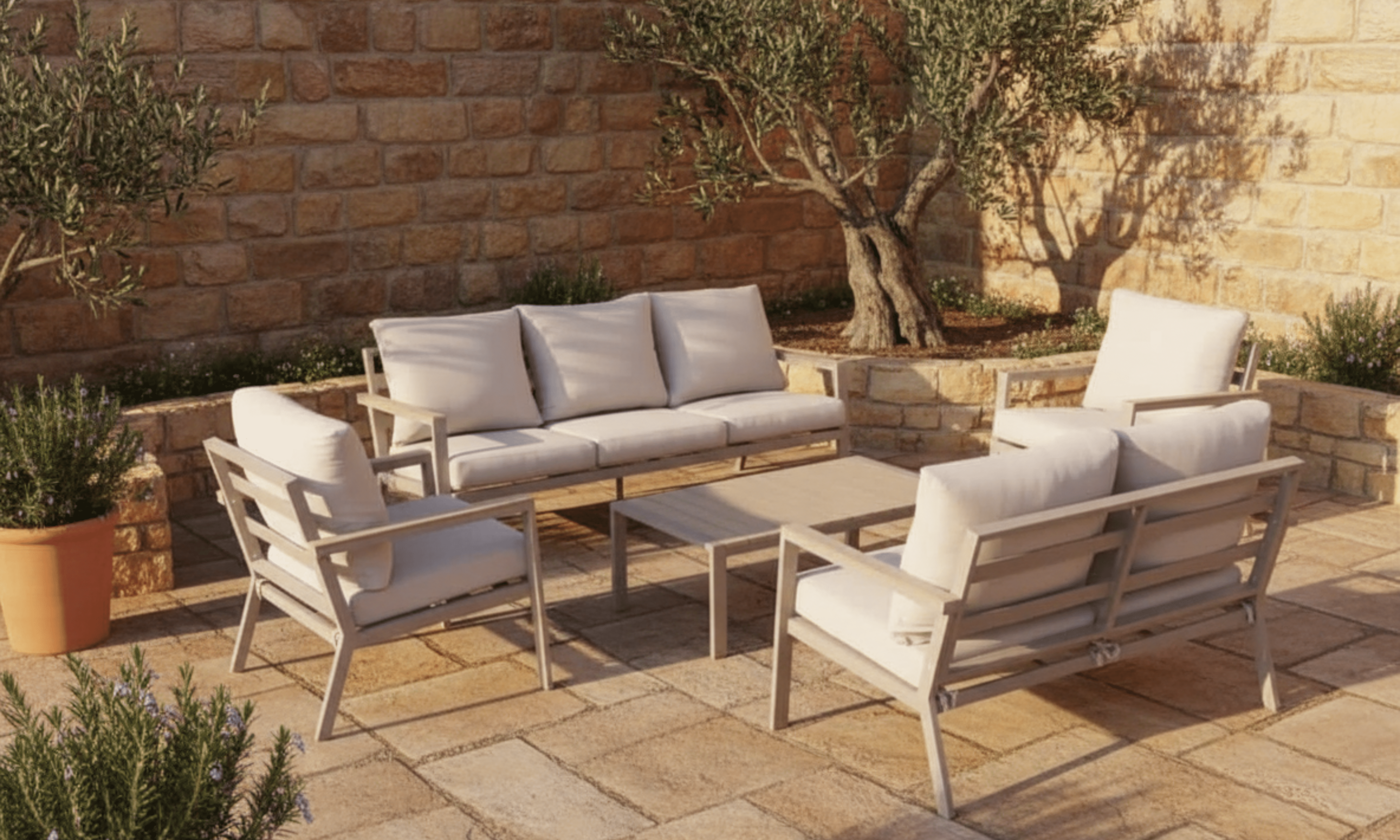 פינת ישיבה בעיצוב מודרני ואלגנטי, המתאימה לגינה ולמרפסת.
