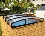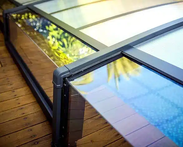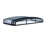 קירוי טלסקופי קל משקל, נע בצורה חלקה ללא מסילות, מה שמאפשר גישה נוחה לבריכה מכל צד. עשוי לוחות פוליקרבונט שקופים ועמידים להגנה מלאה מפני קרינת UV ולשמירה על טמפרטורת המים. מבנה האלומיניום המצופה בתקן Qualicoat® Qualimarine מבטיח עמידות גבוהה בכל תנאי מזג האוויר.