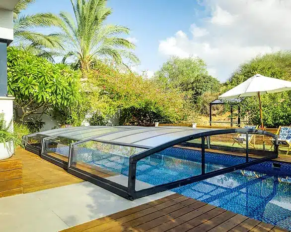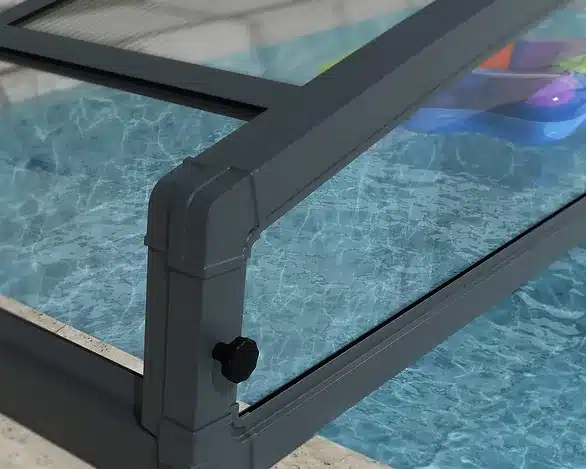 קירוי קשיח לבריכה עם שלדת אלומיניום עמידה, לוחות פוליקרבונט שקופים והגנה מלאה מפני קרינת UV, לכלוך ושינויי טמפרטורה. מספק גישה נוחה, פתיחה קלה ובטיחות מוגברת לילדים עם מערכת נעילה מתקדמת, ומאפשר ליהנות מהבריכה בכל עונות השנה.