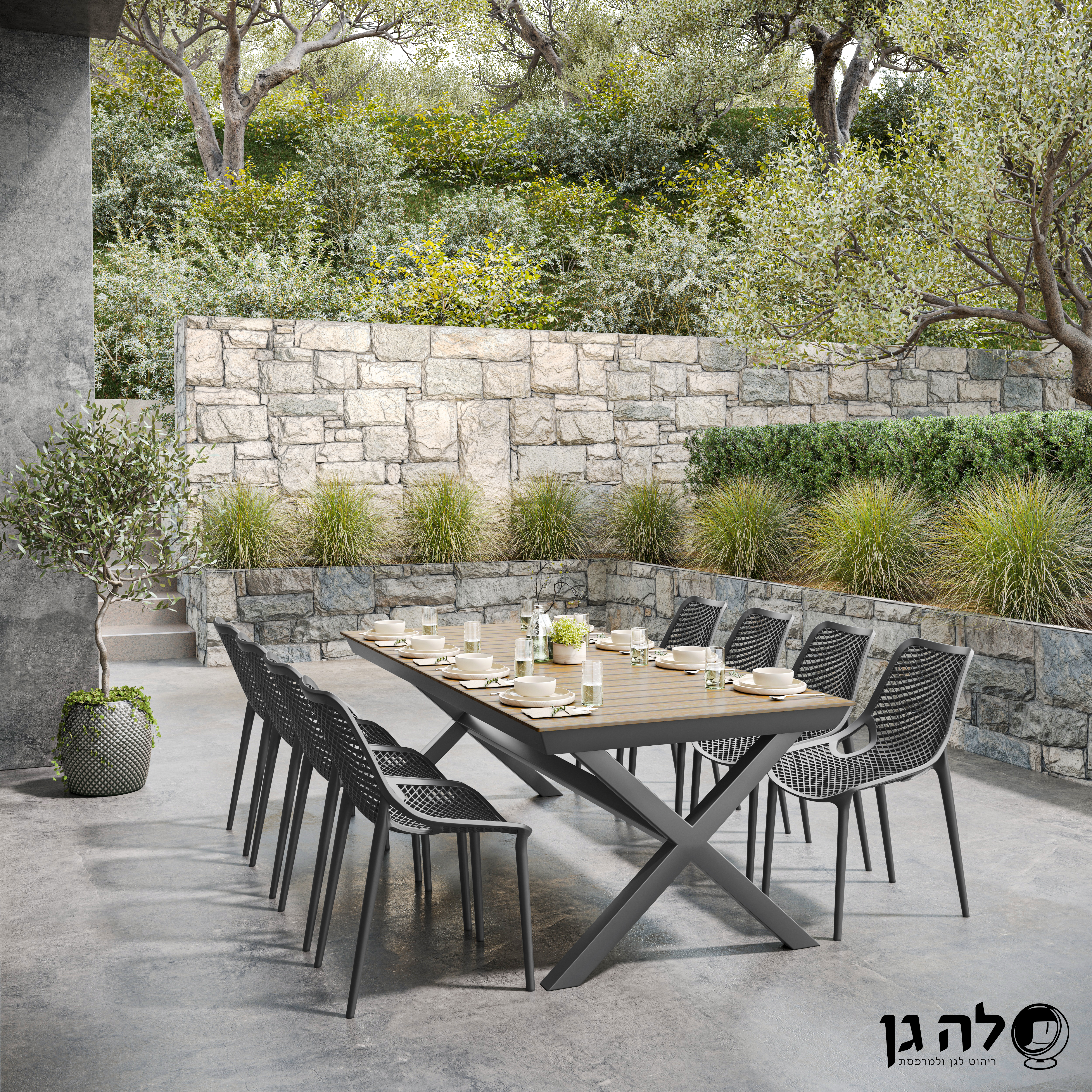 משטח השולחן דמוי עץ, רגלי השולחן מעוצבות בצורת X מרשימה במיוחד, מה שמייעל את המיקום של הכסאות בשולחן.