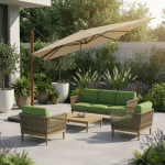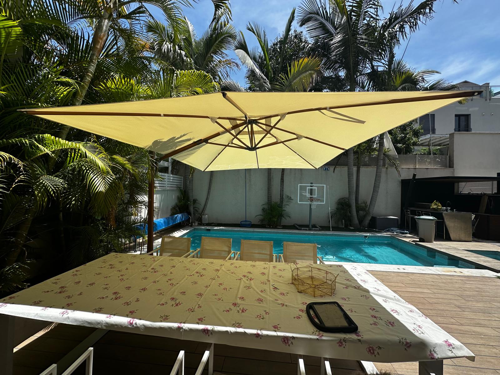 שמשיית רומא בעיצוב מרשים בגוון דמוי עץ טבעי היא פתרון הצללה אידיאלי לגינה, מרפסת או מתחם אירוח חיצוני.